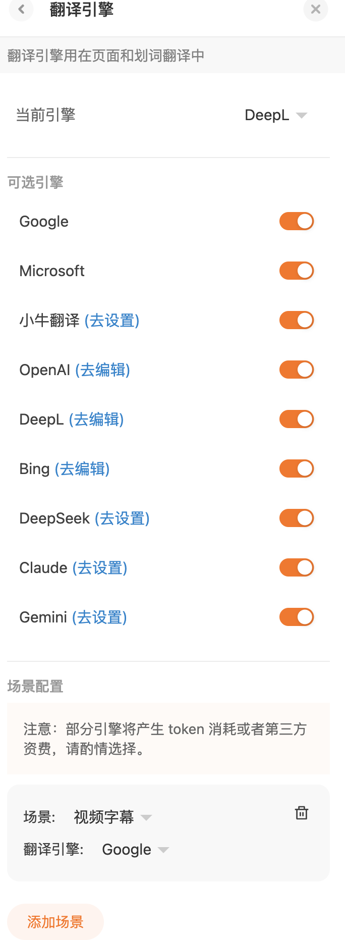 1、设置 → 翻译引擎 → 更换即可